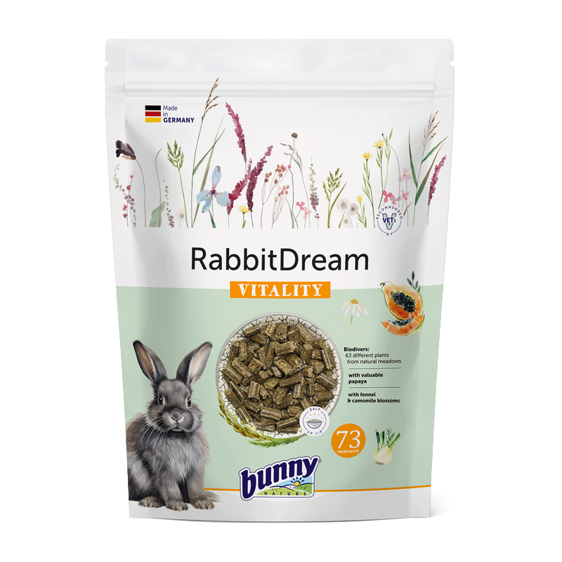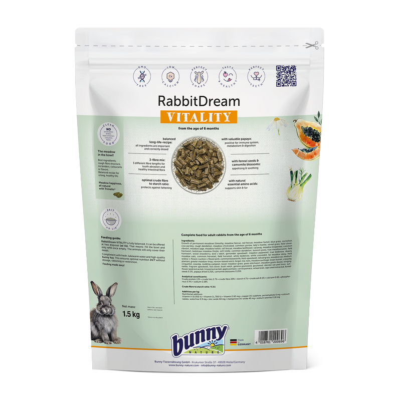 L’aliment complet Granulés Lapin Vitalité associe 63 plantes et herbes issues de prairies non traitées à des ingrédients naturels comme la papaye, le fenouil et la camomille. Ce mélange harmonieux soutient la digestion, renforce la flore intestinale et contribue à la beauté du pelage. Sa formule riche en fibres favorise l’usure naturelle des dents et le maintien d’un poids optimal.