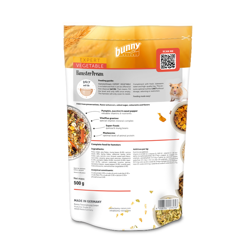 L’aliment complet Hamster aux légumes propose un mélange naturel sans pellets ni extrudés, riche en légumes variés tels que la citrouille, la courgette et le poivron. Ce mélange équilibré apporte vitamines, fibres et énergie de qualité, soutenant la vitalité, la digestion et le bien-être quotidien des hamsters.